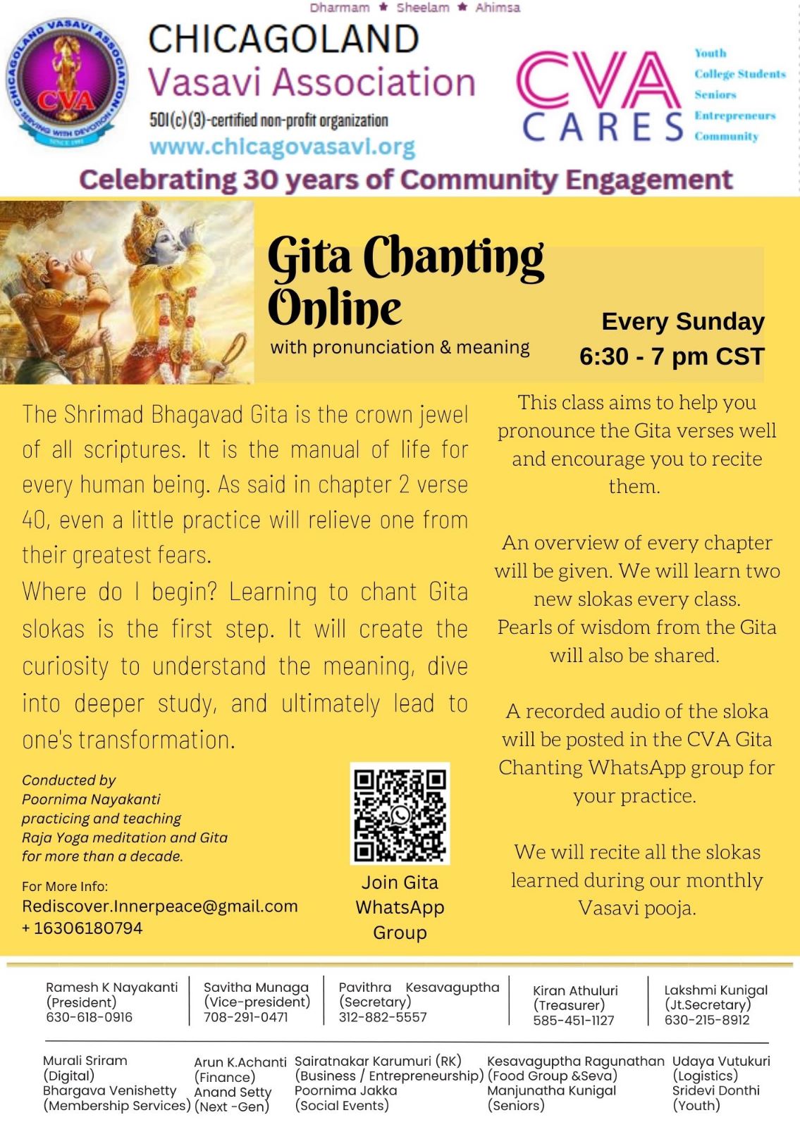 Please join CVA weekly Gita Chanting sessions on Sunday. Please check the flyer for more details