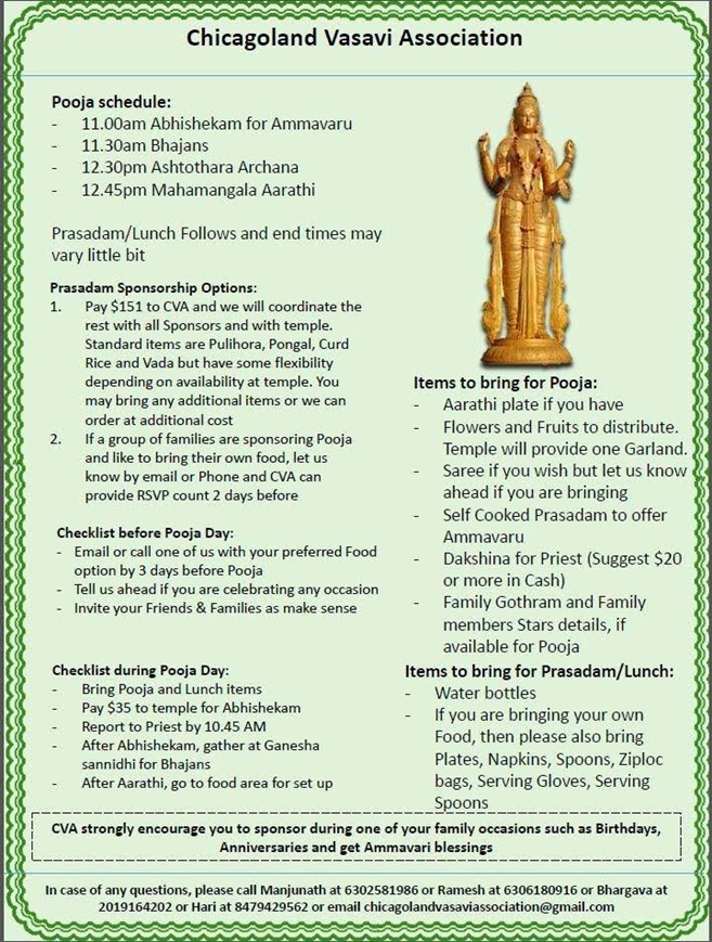 Vasavi Matha Abhishekam is held on the 3rd Sunday of every month at Balaji Temple, Aurora IL. CVA encourages all families to sponsor monthly Ammavari abhishekam.